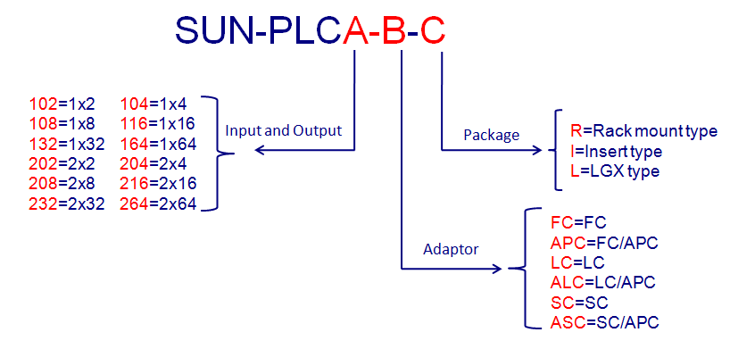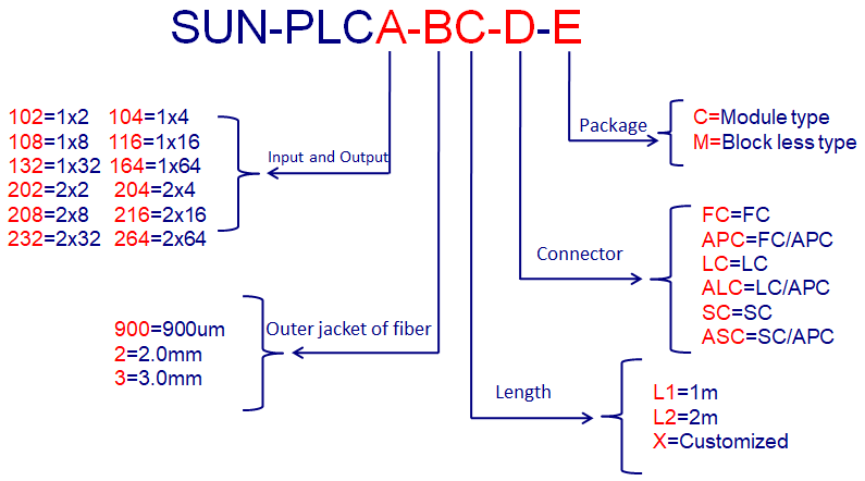 Splitting ratio: 1x2, 1(2)x4, 1(2)x8, 1(2)x16, 1(2)x32, 1(2)x64