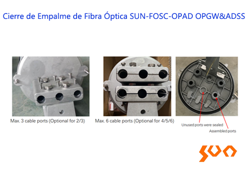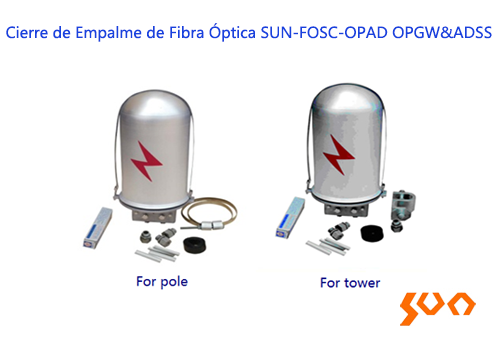 | SUN-FOSC-OPAD-48-T | Tipo domo, sellado mecánico; 48 fibras, 1 bandeja de 48 fibras/bandeja (48 ranuras/bandeja) incluida; 4 puertos de cable, capacidad máxima: 144 fibras; IP65, material : aleación de aluminio, dimensiones (mm): 200 (P) x 480 (H); Con accesorios para montaje en torre; Adecuado para cable OPGW y ADSS | ||
