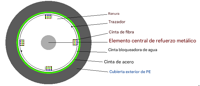 Cable de fibra óptica tipo cinta GYDGS, estructura esquelética, miembro central de resistencia metálico, cubierta de PE