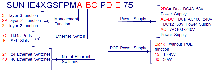 | SUN-IE4X G SFPM 2P -C 24 - P30-2DC -75 | Conmutador de fibra óptica | Grado industrial, administrado ( función de capa 2+ ),4 puertos SFP+ 10G, 24 puertos RJ45 10/100/1000Mpbs; Montaje en rack, con función POE, alimentación POE de 30 W, alimentación dual: CC 48 ~ 58 V; Temperatura de funcionamiento (°C): -40 ~ +75; Dimensiones (mm): 440 (largo) x 245 (ancho) x 45 (alto) |
