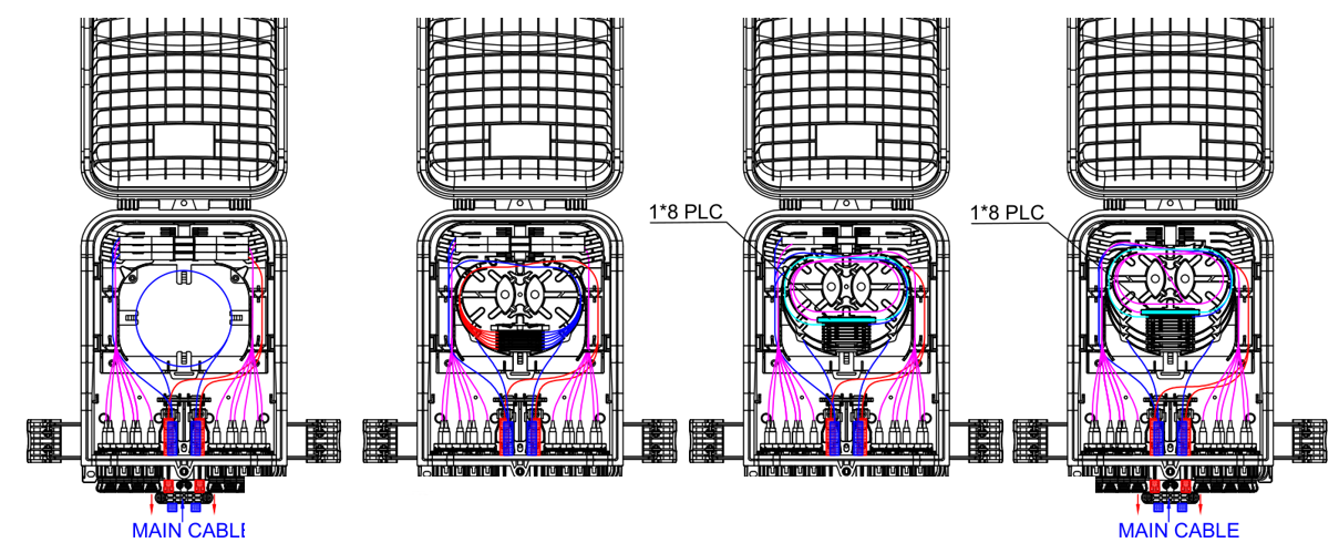 Outdoor, 1 2:32,2 1:16, 4 1:8 splitters, 5 splicing trays, Max Adaptors: 36